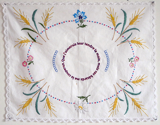 J'ai pu travailler tout l'été dans les trois pièces de l'appartement qui m'était dédié et me suis servi pour l'exposition finale en partie de ce que j'ai trouvé sur place, ainsi toute une série de collages réalisés uniquement à base de livres et revus trouvés dans les appartements de la cité, et aussi quelques napperons rebrodés, dont l'un avec une citation du groupe PNL (dont les frères ont vécus un temps dans l'ensemble).